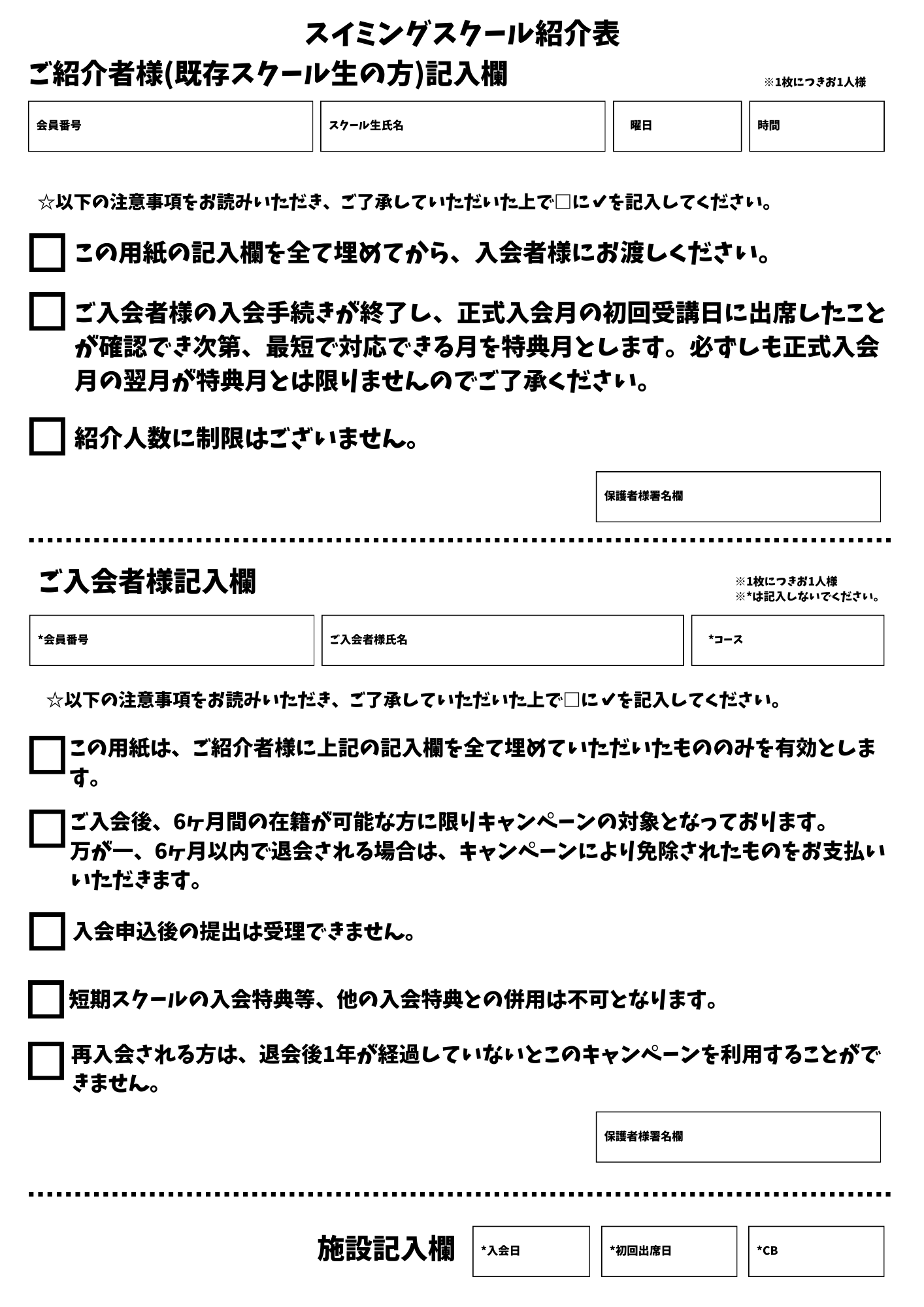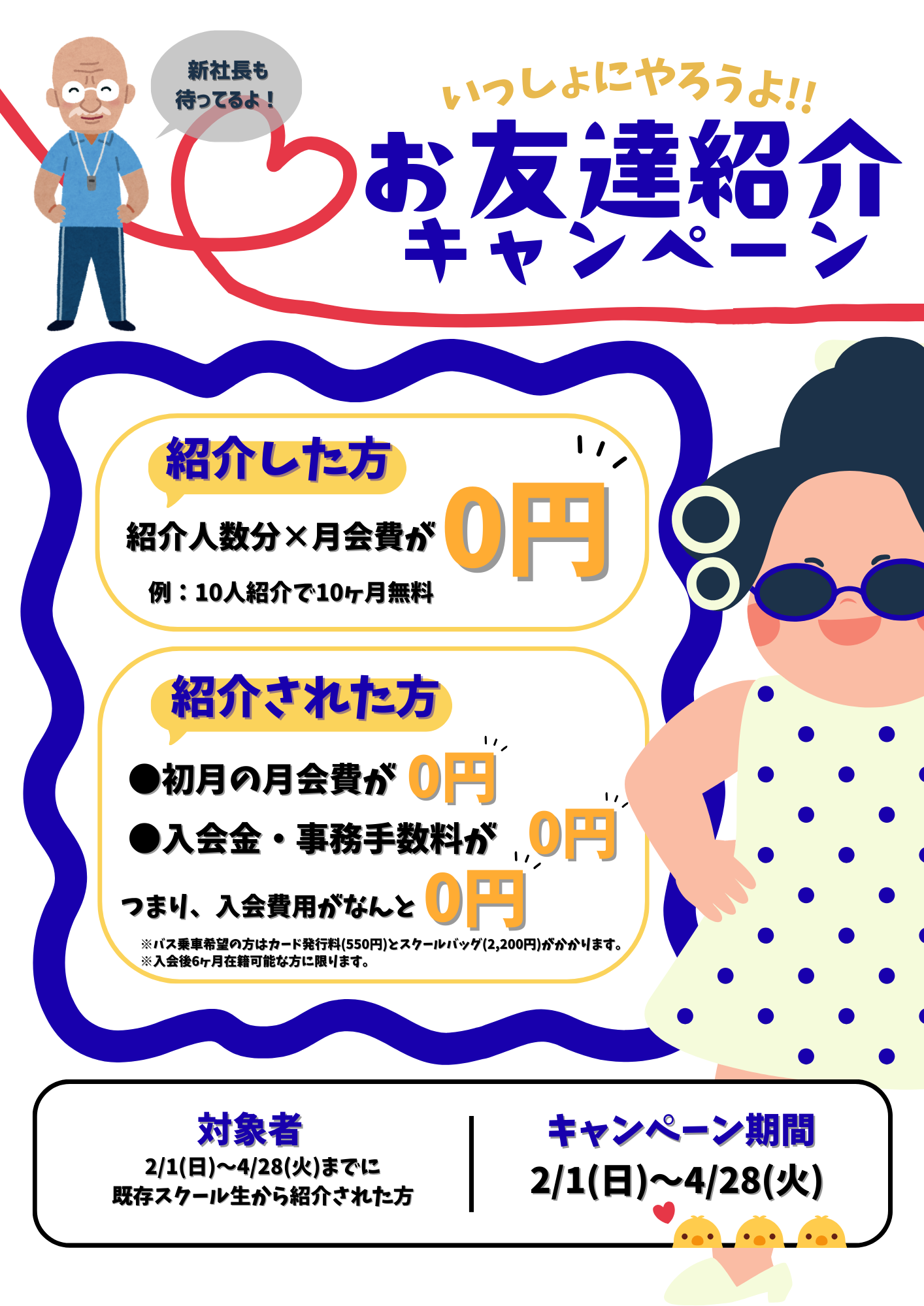 いっしょにやろうよ!!お友達紹介キャンペーン ☆0円入会キャンペーン☆ 2月より始まる紹介キャンペーンのお知らせです! 今回は今までのキャンペーンよりさらにパワーアップしてお得になっています! ☆紹介した方 紹介したお友達が入会すると、紹介者の人数分のお月謝が無料! ☆紹介された方 初月のお月謝、事務手数料が全て無料! 紹介者の人数に制限はございませんので、ぜひこの機会にお友達をお誘いください! *キャンペーン適用には紹介表が必要となりますので予めご記入の上、紹介者様にお渡しください。