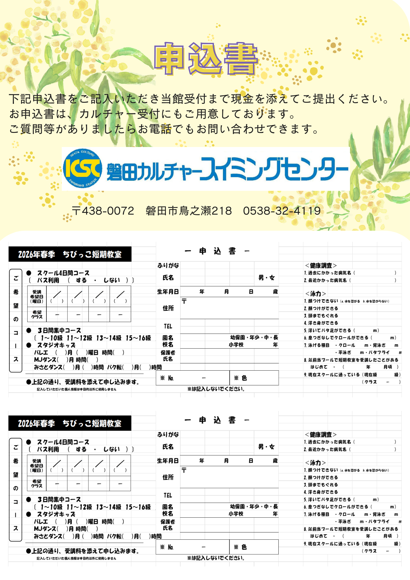 お申し込みは、カルチャースイミングセンター受付まで現金を添えてお申し込みください!